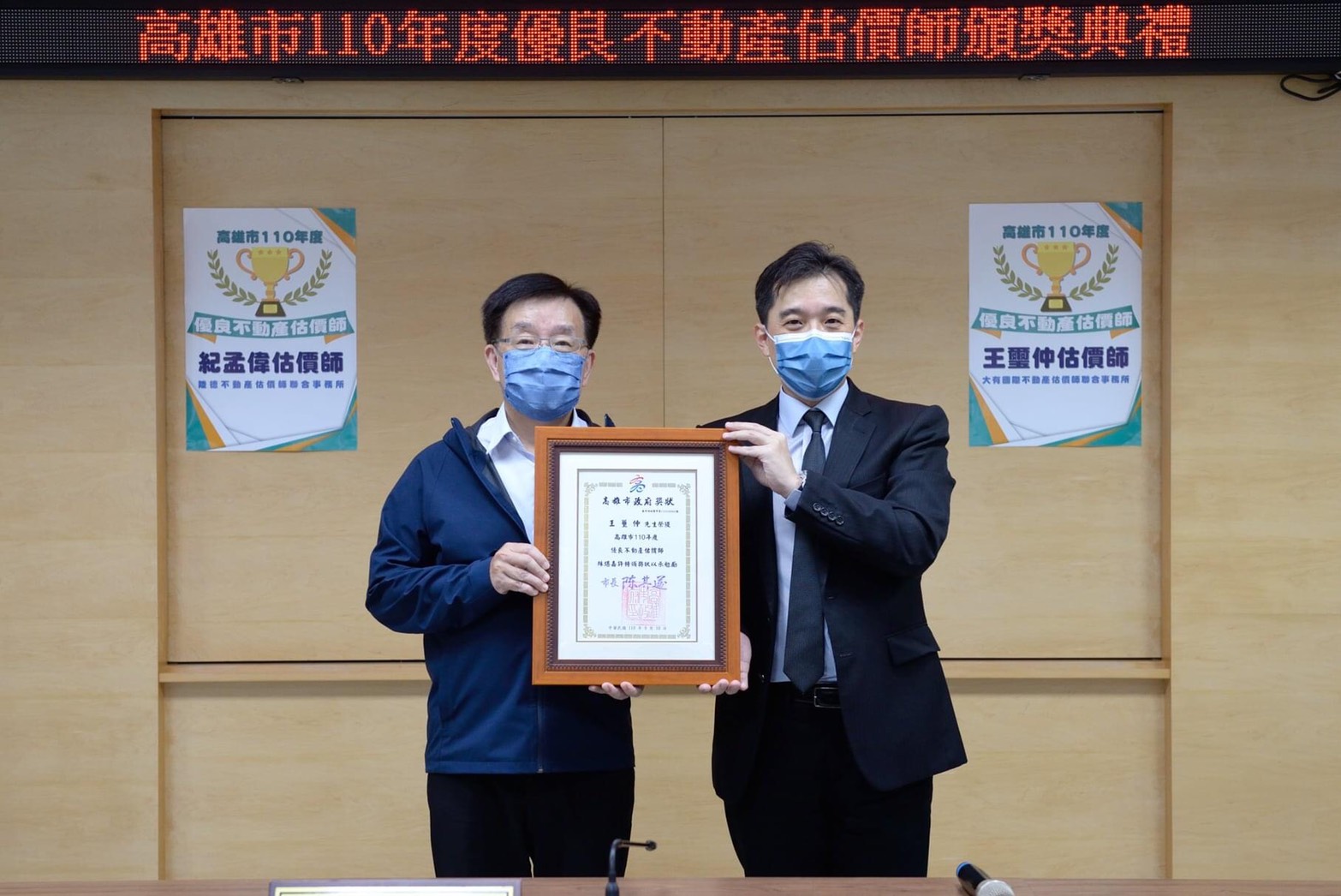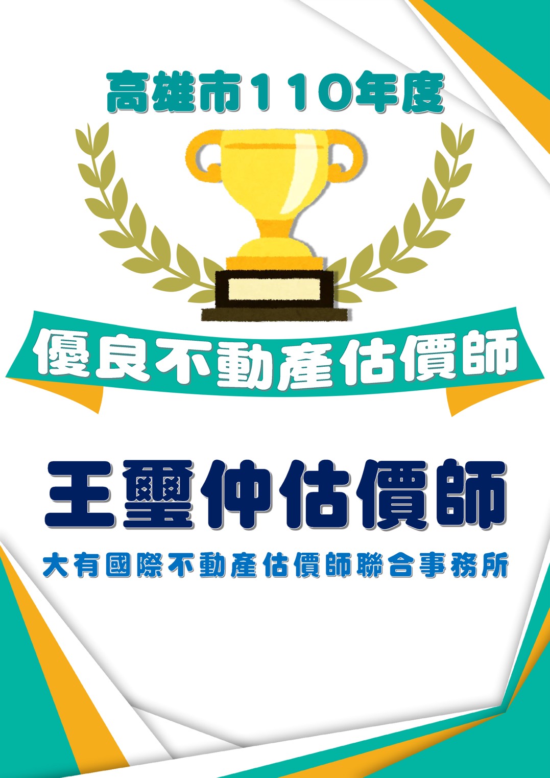 恭喜!!大有國際不動產估價師聯合事務所所長王璽仲榮獲高雄市110年度優良估價師